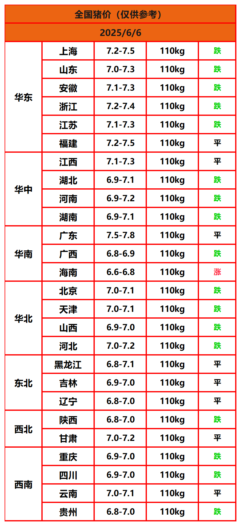 2025年6月5日猪价,今日全国猪价行情走势:0涨3平23跌。